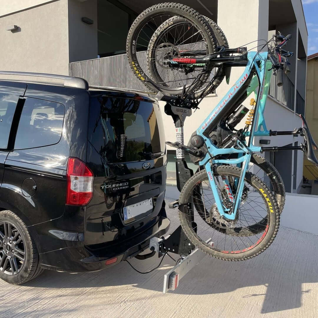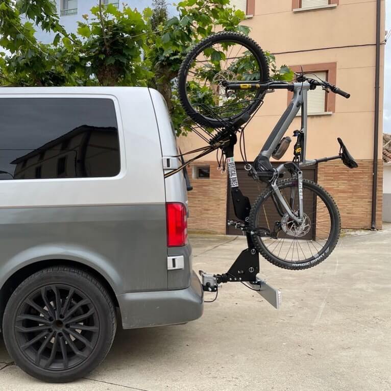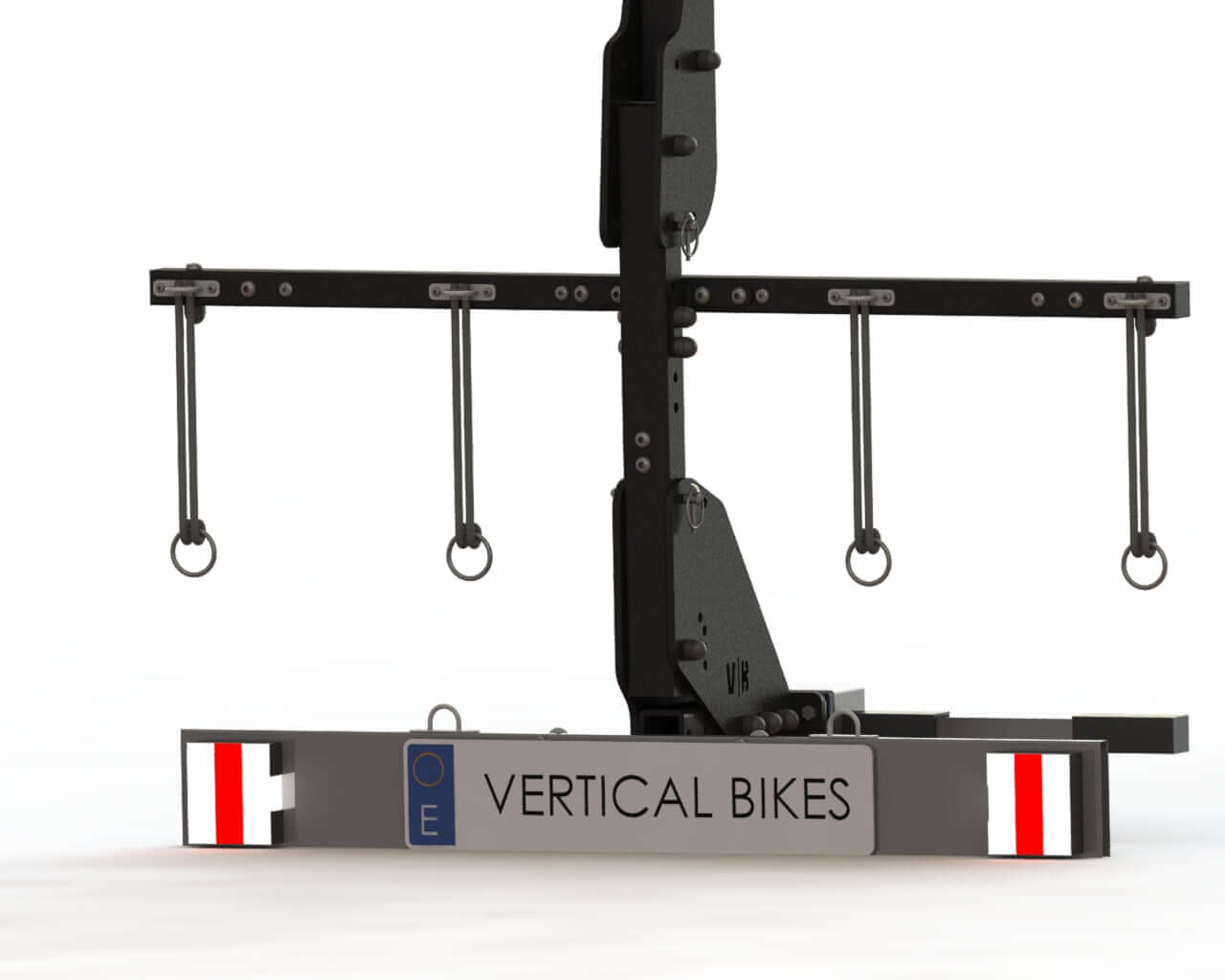 Er verfügt über ein Regulierungssystem, mit dem er sich näher an das Heck des Fahrzeugs heran- oder davon wegbewegen lässt, falls sich hinten ein Ersatzrad befindet. Eine weitere hervorzuhebende Funktion ist, dass sich der Fahrradträger von Vertical Bikes bis zum Boden neigen lässt und so jeder Kofferraum oder jede Heckklappe problemlos geöffnet werden kann.