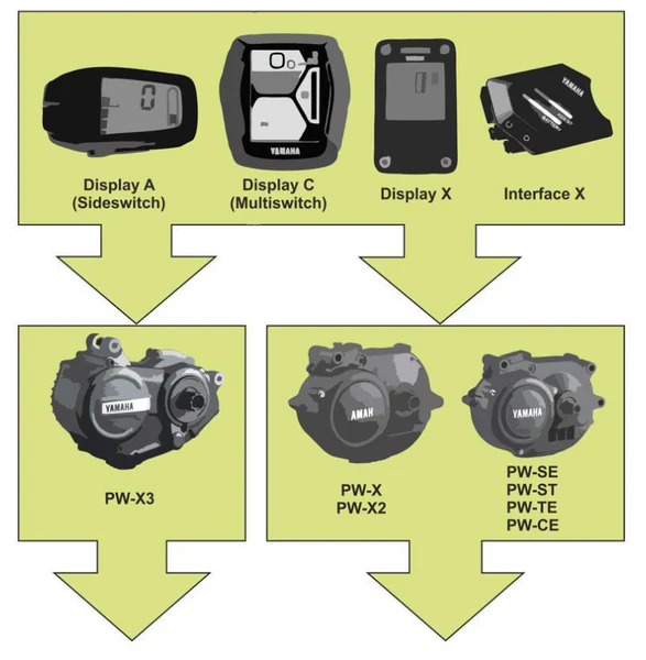 De motorpoorten van de nieuwe Yamaha PX-X3-motor zijn opnieuw ontworpen en daarom zijn afstellingen van de vorige Yamaha-motorgeneraties PW-X, PW-X2, PW-ST, PW-TE, PW-CE en PW-SE NIET compatibel.