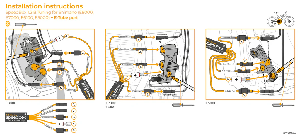 For the SpeedBox Shimano tunings please check if there is a wire inserted into the engine E-Tube Port. E-bikes, which do not have a free E-Tube port, are usually those with a Di2 electronic gear shifting system, with a tube integrated Satellite System ON/OFF Switch (EW-SW100, EW-SW300), or all e-bikes with E5000 motor.