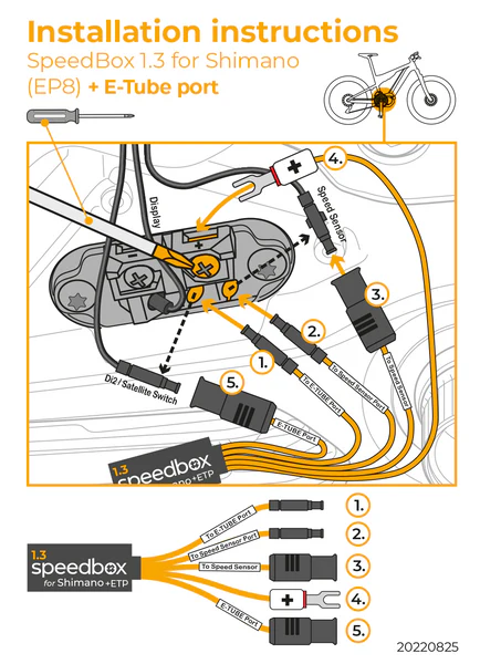 SpeedBox 1.3 Shimano + E-Tube Port Completely remove the speed limitation of Shimano EP8 engines , speed accuracy is retained up to 23 km/h. Option to turn ON/OFF the tuning via display.