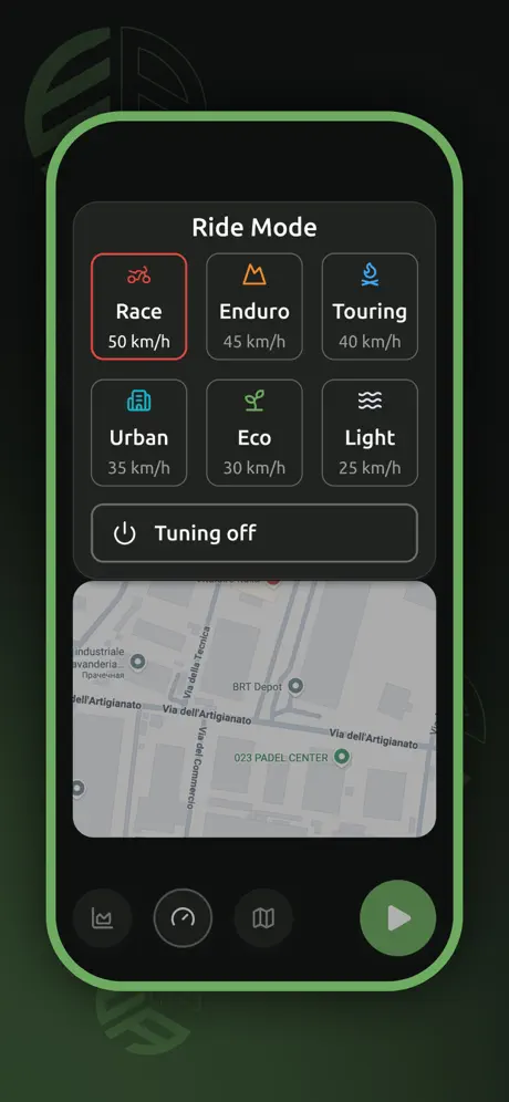 The EPAspeed App is custom-built for seamless integration with the EPAspeed 1.0 B.Tuning chip via Bluetooth. Once connected, your smartphone becomes a powerful dashboard, showing real-time ride statistics and storing trip data for later review. Share and compare your rides with friends, track your progress, and keep an eye on every detail — all from your phone.
